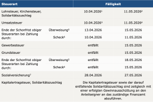 • Umsatzsteuervoranmeldungen und Lohnsteueranmeldungen müssen grundsätzlich bis zum 10. des dem Anmeldungszeitraum folgenden Monats (auf elektronischem Weg) abgegeben werden. Fällt der 10. auf einen Samstag, Sonntag oder Feiertag, ist der nächste Werktag der Stichtag. Bei einer Säumnis der Zahlung bis zu drei Tagen werden keine Säumniszuschläge erhoben. Eine Überweisung muss so frühzeitig erfolgen, dass die Wertstellung auf dem Konto des Finanzamts am Tag der Fälligkeit erfolgt.